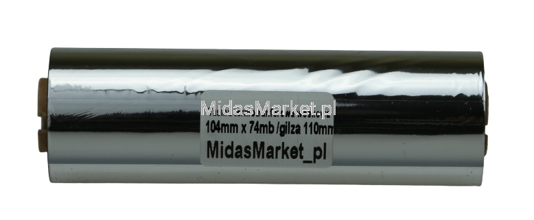 Czarna taśma TTR (Thermal Transfer Ribbon)/kalka/folia termotransferowa WOSKOWA o szerokości 104mm i długości 74mb nawinięta na gilzę/rolkę o średnicy 1/2" (13mm) i długości 110mm.