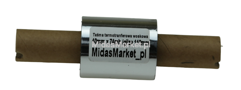 Czarna taśma TTR (Thermal Transfer Ribbon)/kalka/folia termotransferowa WOSKOWA o szerokości 40mm i długości 74mb nawinięta na gilzę/rolkę o średnicy 1/2" (13mm) i długości 110mm.