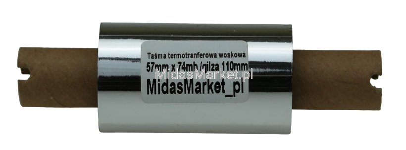 Czarna taśma TTR (Thermal Transfer Ribbon)/kalka/folia termotransferowa WOSKOWA o szerokości 57mm i długości 74mb nawinięta na gilzę/rolkę o średnicy 1/2" (13mm) i długości 110mm.