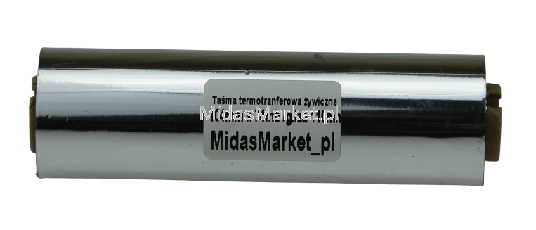 Czarna taśma TTR (Thermal Transfer Ribbon)/kalka/folia termotransferowa ŻYWICZNA o szerokości 104mm i długości 74mb nawinięta na gilzę/rolkę o średnicy 1/2" (13mm) i długości 110mm.