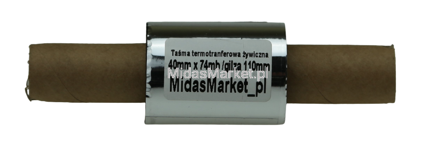Czarna taśma TTR (Thermal Transfer Ribbon)/kalka/folia termotransferowa ŻYWICZNA o szerokości 40mm i długości 74mb nawinięta na gilzę/rolkę o średnicy 1/2" (13mm) i długości 110mm.